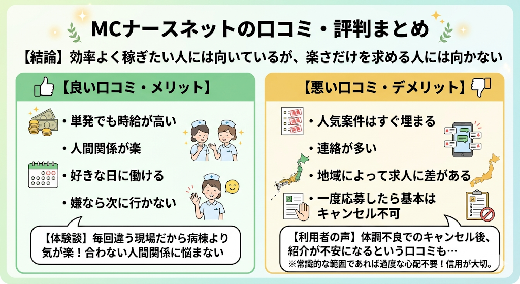 MCナースネットの口コミ・評判を調べると、「単発でも稼げる」「人間関係が楽」といった良い声がある一方で