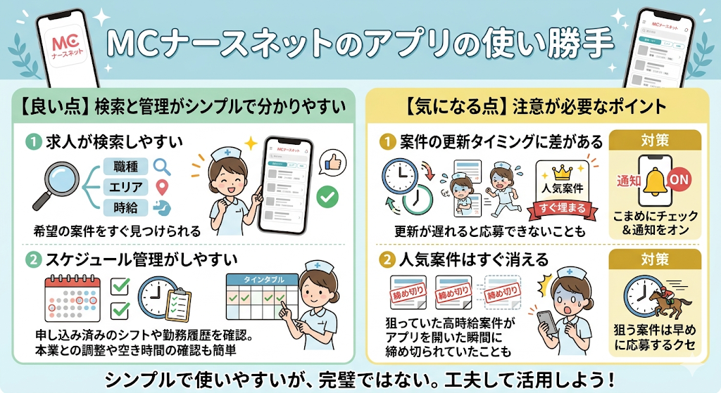 MCナースネットのアプリには便利な点が多い一方で、注意したほうがいいポイントもあります。