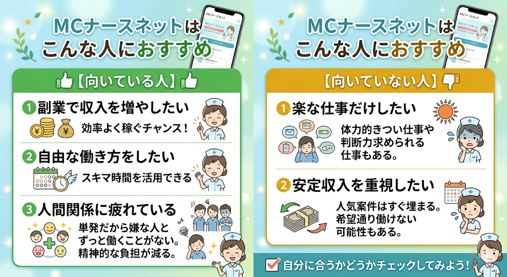 MCナースネットは、働き方の自由度が高い分、向いている人・向いていない人がはっきり分かれるサービスです。