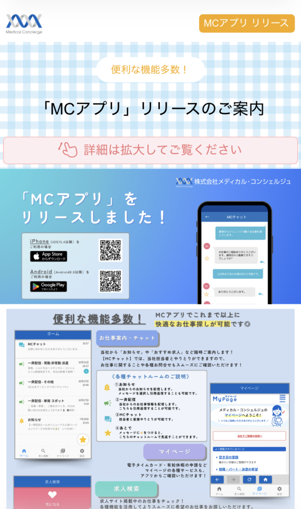 MCナースネットの専用アプリ「MCアプリ」ではお仕事探しから就業後の管理まで、スマホひとつで完結する便利な機能が揃っています。