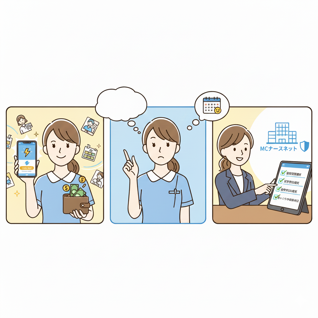 「とにかく早く現金が欲しい人」には別の選択肢もありますが、安心して長く単発バイトを続けたい人にとってはMCナースネットは心強い選択肢のひとつです。